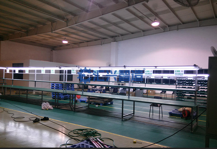 鏈板線采用A3板折制鏈板線專用軌道,而副導(dǎo)軌則采用角鐵制作。其中傳輸鏈條采用的是工業(yè)專用鏈板線鏈條;照明是采用單支帶罩T8LED日光燈,兩側(cè)連續(xù)安裝;工具吊軌采用專用風(fēng)批吊軌鋁材,兩側(cè)每米安裝一套風(fēng)批滑輪。此外,工藝看板采用專用雙杠H型鋁材做支架,每米配置一套亞克力板;采用6分鍍鋅制作而成的氣管和采用鍍鋅腳杯制作而成的地腳,共同為鏈板線的高效輸送保駕護(hù)航,能有力確保生產(chǎn)線的順利運(yùn)行。