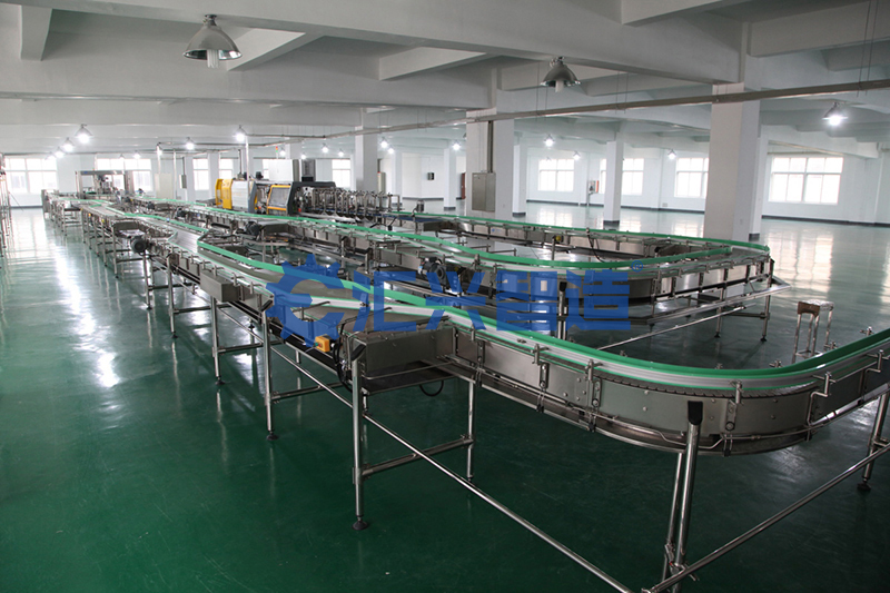 鏈板輸送線以標(biāo)準(zhǔn)鏈板為承載面,由馬達(dá)減速機(jī)為動(dòng)力傳動(dòng);我們可以通過多列鏈板并行,使鏈板輸送線做的很寬并形成差速,利用多列鏈板的速度差使多列輸送在無擠壓的情況下變?yōu)閱瘟休斔?,從而滿足飲料貼標(biāo)、灌裝、清洗等設(shè)備的單列輸送的要求,同樣也可以使單列變成多列并行走緩慢,從而產(chǎn)生儲(chǔ)存量,滿足殺菌機(jī)、儲(chǔ)瓶臺(tái)、冷瓶機(jī)的大量供料的要求,我們可以將兩條鏈板輸送線的頭尾部做成重疊式的混合鏈?zhǔn)沟闷浚ü蓿w處于動(dòng)態(tài)過度狀態(tài),使輸送線上不滯留物料,可以滿足空瓶以及實(shí)瓶壓力和無壓力輸送。