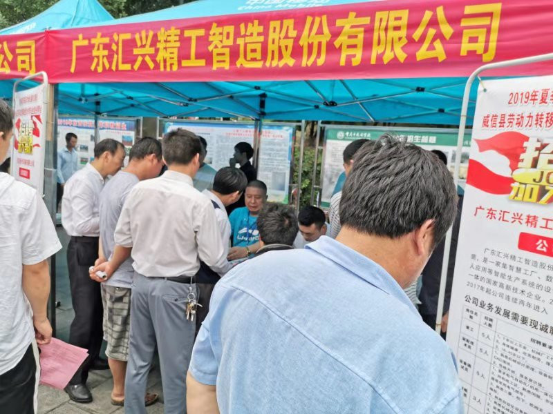 由威信縣委、縣政府,東莞市大嶺山鎮(zhèn)黨委、政府主辦,威信縣人社局、東莞市大嶺山鎮(zhèn)人社分局承辦的“2019年夏季東莞市大嶺山鎮(zhèn)對口幫扶威信縣農(nóng)村勞動力轉(zhuǎn)移就業(yè)專場招聘會”在云南威信縣體育館廣場隆重舉行。此次招聘會有來自廣東省大嶺山鎮(zhèn)的名優(yōu)企業(yè)10余家,大嶺山鎮(zhèn)提供就業(yè)崗位500余個。招聘會現(xiàn)場氣氛熱烈,其中匯興智造集團招聘位置前排成長長的隊伍,應(yīng)聘者禮貌有序地排隊填寫應(yīng)聘表。