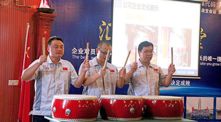 會議由行政部經(jīng)理袁侃主持。會議在激昂的《匯興之歌——用心智造世界》 拉開帷幕,全體參會人員向企業(yè)核心價值觀“孝道、商道、人道”行三鞠躬禮,宣讀企業(yè)愿景——成為全球領先的整廠自動化系統(tǒng)解決方案提供商,企業(yè)使命——做受尊敬的好人、造受尊敬的產(chǎn)品、辦受尊敬的企業(yè)、建受尊敬的平臺,企業(yè)精神——用情做人、用心做事,團隊精神——忠誠團結(jié)、勤奮進取。隨后,匯興智造干部職員代表鐘建輝、彭大海,鄭建團共同敲響士氣鼓,鼓舞匯興智造牢記初心,砥礪前行。