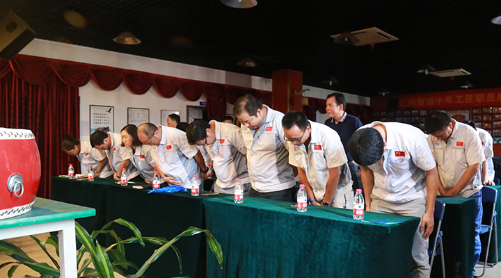會議開始,參會人員整肅衣冠、端身正意,滿懷赤誠之心向企業(yè)三道文化“孝道、商道、人道”行三鞠躬禮,宣讀企業(yè)愿景——成為全球領(lǐng)先的整廠自動化系統(tǒng)解決方案提供商,企業(yè)使命——做受尊敬的好人、造受尊敬的產(chǎn)品、辦受尊敬的企業(yè)、建受尊敬的平臺,企業(yè)精神——用情做人、用心做事,團隊精神——忠誠團結(jié)、勤奮進取。