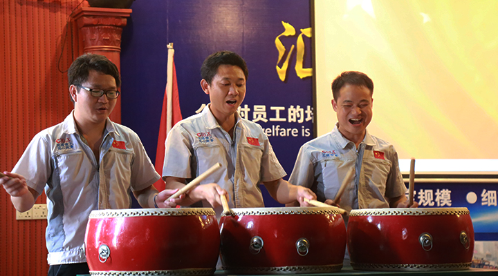 隨后,東莞分公司廠長歐陽輝鳳、智能裝備研發(fā)中心工程師鐘揚、裝配測試技術(shù)員劉洋「三陽開泰」共同敲響士氣鼓、鼓舞匯興智造奮勇前進。
