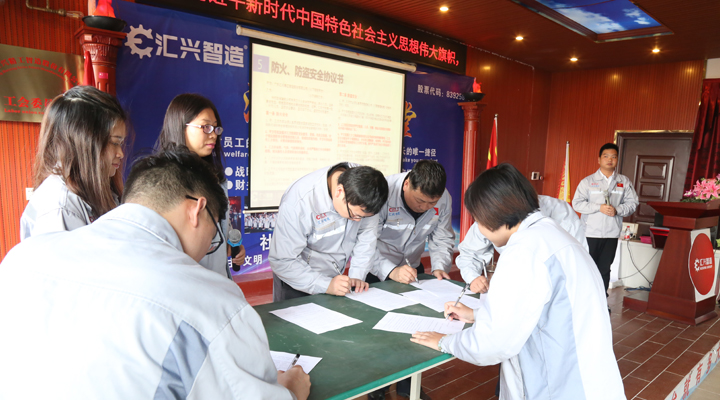 璞玉有瑕,有先進,就有落后,有表揚,就有懲戒。沒有規(guī)矩,不成方圓,所以大會的第四個議程對公司管理制度做了進一步宣講和引導(dǎo)。人事經(jīng)理袁侃結(jié)合實際案列,諄諄告誡全體員工遵守法律、行政法規(guī)、公司制度,不要以身試法、以身犯險。并發(fā)起第五個會議議程,倡議匯興智造全體員工簽訂《防火、防盜安全協(xié)議書》,各部門負責人率先上臺在協(xié)議書上簽字,用實際行動表決心。