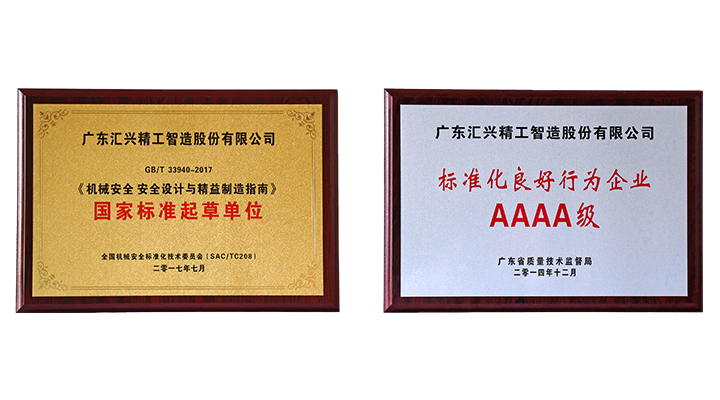 2017年8月30日,經(jīng)廣東省質(zhì)量技術(shù)監(jiān)督局、省標(biāo)準(zhǔn)化協(xié)會專家組的現(xiàn)場評審,廣東匯興精工智造股份有限公司(股票代碼:839258)再度獲評為“AAAA級標(biāo)準(zhǔn)化良好行為企業(yè)”及《機械安全 安全設(shè)計與精益制造指南》國家標(biāo)準(zhǔn)起草單位,在行業(yè)中到示范引領(lǐng)作用。
