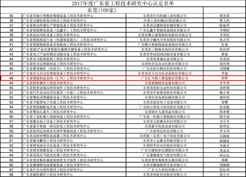 2017年9月25日,匯興智造設(shè)立的 “廣東省智能制造系統(tǒng)(匯興)工程技術(shù)研究中心”被廣東省科技廳認(rèn)定為“2017年度廣東省工程技術(shù)研究中心”。省級(jí)工程技術(shù)研究中心的建設(shè)是為了深入貫徹落實(shí)廣東省科技創(chuàng)新大會(huì)精神,推進(jìn)規(guī)模以上企業(yè)建立研發(fā)機(jī)構(gòu),增強(qiáng)高校和科研院所的技術(shù)創(chuàng)新能力,加快科技成果轉(zhuǎn)化,為建設(shè)國(guó)家科技產(chǎn)業(yè)創(chuàng)新中心提供支撐。
