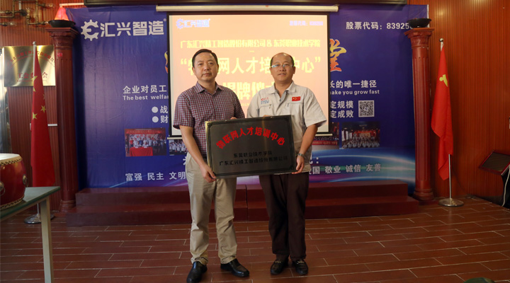 2017年9月27日下午, 東莞職業(yè)技術(shù)學(xué)院副院長(zhǎng)楊云奇,計(jì)算機(jī)工程系主任胡選子博士,藝術(shù)設(shè)計(jì)系主任何鳳梅博士,計(jì)算機(jī)系曹文梁教授等專(zhuān)家人員一行蒞臨廣東匯興精工智造股份有限公司(股票代碼:839258)考察調(diào)研并舉行“物聯(lián)網(wǎng)人才培訓(xùn)中心“基地揭牌儀式。匯興智造董事長(zhǎng)鐘輝,匯興中德智能制造研究院院長(zhǎng)李康順教授熱情接待了調(diào)研組一行。