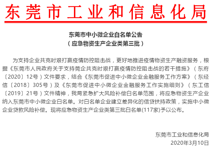 疫情防控期間,為了推動(dòng)企業(yè)順利復(fù)工復(fù)產(chǎn),東莞市陸續(xù)推出系列“暖企政策”,以“組合拳”的方式幫助企業(yè)解決復(fù)工復(fù)產(chǎn)中遇到的實(shí)際問題。為全力支持和推動(dòng)新冠肺炎疫情防控物資和裝備生產(chǎn)企業(yè)復(fù)工復(fù)產(chǎn)、擴(kuò)大生產(chǎn),2020年2月27日,廣東省工業(yè)和信息化廳出臺(tái)了“支持新冠肺炎疫情防控物資和裝備生產(chǎn)企業(yè)擴(kuò)大生產(chǎn)的獎(jiǎng)勵(lì)政策”,支持疫情防控物資和裝備生產(chǎn)企業(yè)實(shí)施技術(shù)改造、擴(kuò)大生產(chǎn),獎(jiǎng)勵(lì)服從國(guó)家和省醫(yī)療防控物資調(diào)度要求的企業(yè)生產(chǎn)銷售。疫情防控啟動(dòng)以來(lái),為進(jìn)一步用好風(fēng)險(xiǎn)補(bǔ)償專項(xiàng)資金,東莞將應(yīng)急物資生產(chǎn)企業(yè)納入白名單。目前,東莞已將兩批共145家應(yīng)急物資生產(chǎn)企業(yè)納入白名單。
