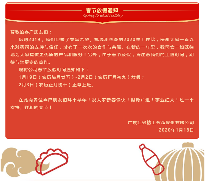 各位親愛的同事、尊敬的客戶: 2020新年伊始,匯興智造在此向大家致以新春的問候和開工復(fù)產(chǎn)的美好祝愿!感謝大......
