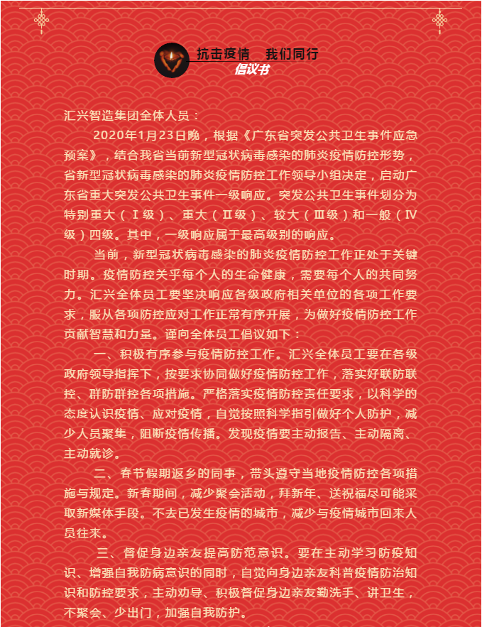 匯興智造集團(tuán)全體人員: 2020年1月23日晚,根據(jù)《廣東省突發(fā)公共衛(wèi)生事件應(yīng)急預(yù)案》,結(jié)合我省當(dāng)前新型......